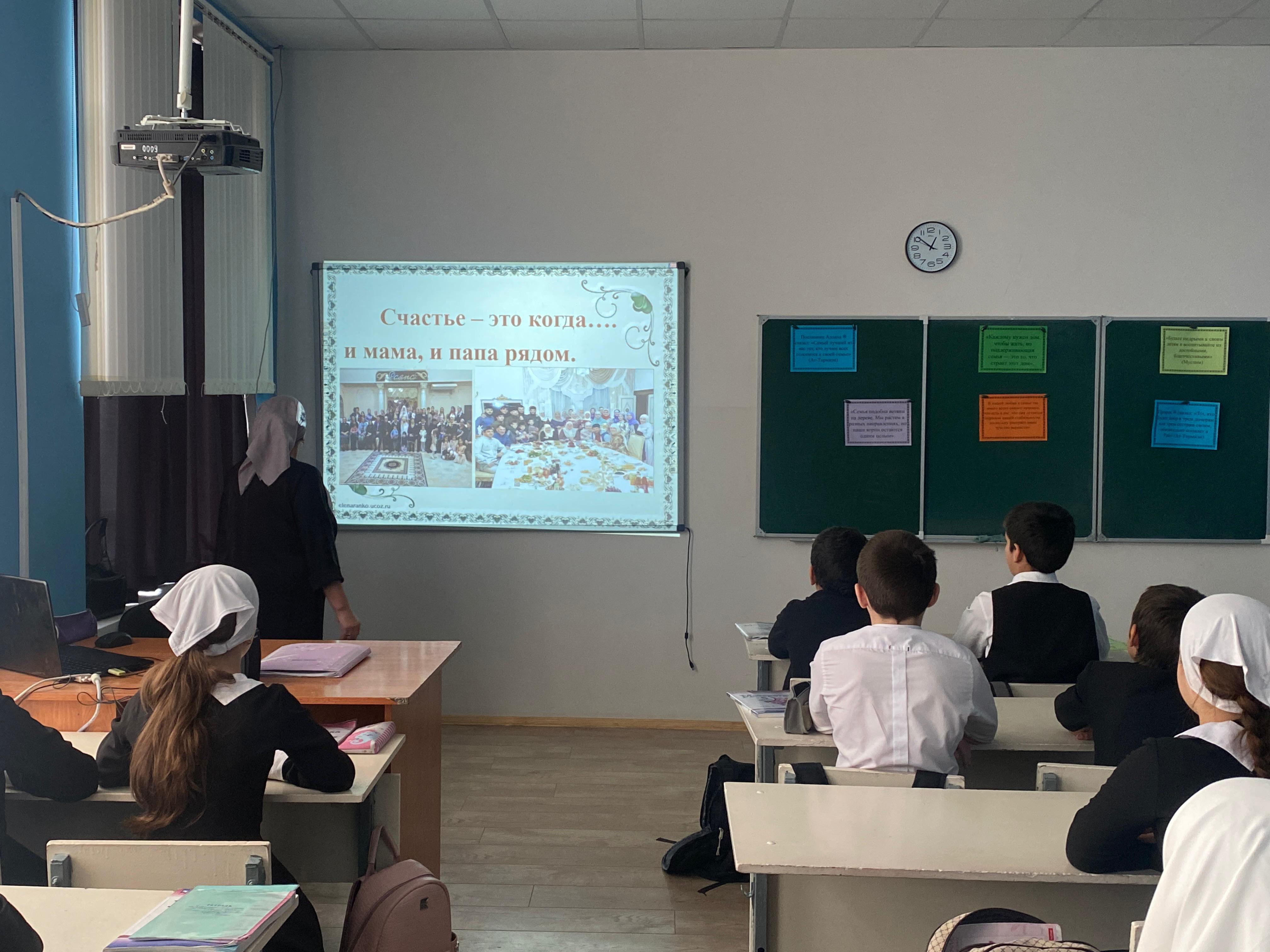 28 ноября 2024 года во 5В классе МБОУ «СОШ №1 с. Гехи» прошел классный час, посвященный Году семьи «Семья – хранитель духовных ценностей». Классный руководитель Амерханова Лиза Хасановна рассказала