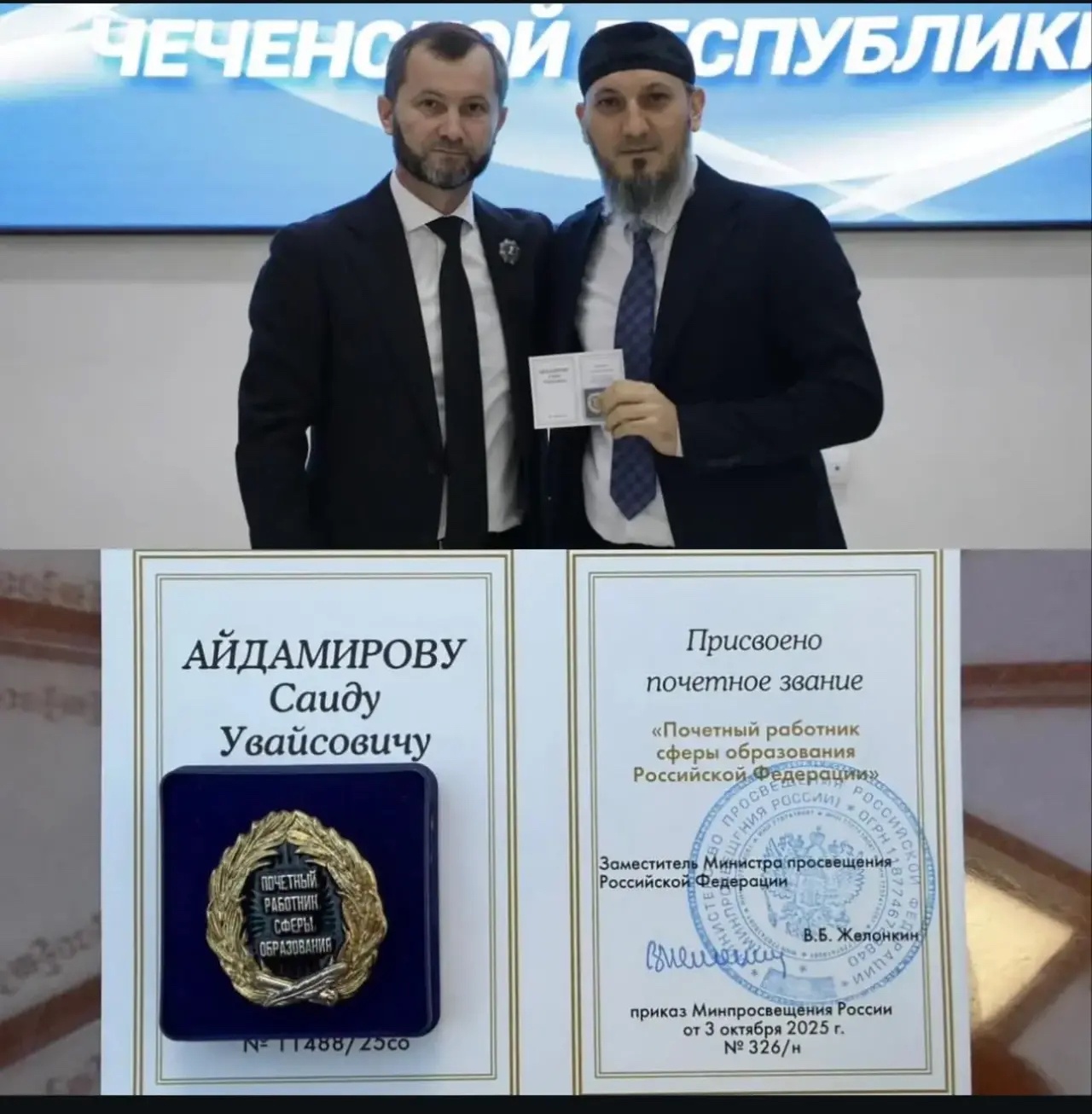 Почетное звание вручено министром образования и науки Чеченской Республики Дааевым Хож-Бауди Буаровичем.